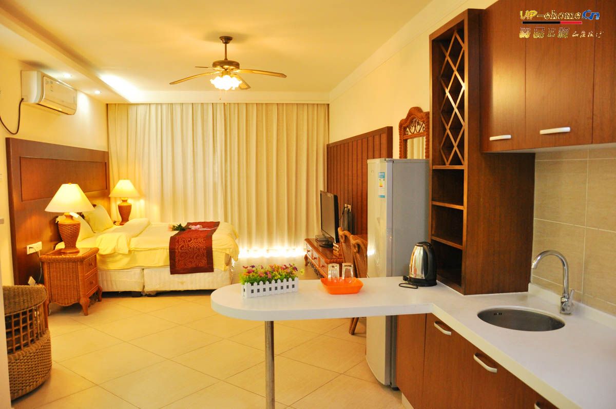 • 装修说明: (58平米开放式一房一厅、免费无线宽带)1.8米大床1张(房型可住2大1小)。空调,热水,液晶有线电视,冰箱,洗衣机,电吹风,电热水壶,沙发、茶几,衣柜,观海茶几、椅子、吧台,橱柜、灶具,独立卫生间、浴室,独立观海阳台.可住